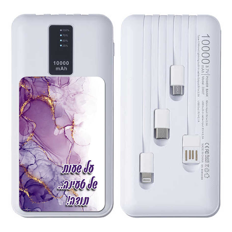 מתנה מהממת למאורסים, חברים, לגבר, לאישה, לצוות או לבוס. מטען נייד 10,000 אמפר עם כבלים מחוברים ‘שעות של טעינה’ הוא איכותי ושימושי ומגיע עם הדפסה של תמונה בשילוב משפט קולע בהדפסה איכותית, יפה ומקצועית.